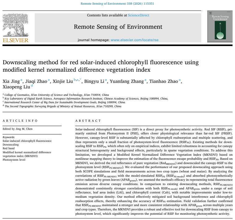 近日,我院竞霞教授在测绘遥感领域国际顶级期刊《Remote Sensing of Environment》发表了题为“Downscaling method for red solar-induced chlorophyll fluorescence using modified kernel normalized difference vegetation index”的研究成果,论文第一作者为竞霞教授,第二作者为硕士研究生赵佳琪,通讯作者为中国科学院空天信息创新研究院刘新杰研究员。RSE期刊(中科院一区TOP,IF=11.4)被公认为测绘遥感领域最权威的期刊,在全球同类SCI学术期刊中长期排名第一,主要发表测绘遥感观测的理论、应用和方法相关的原创文章。